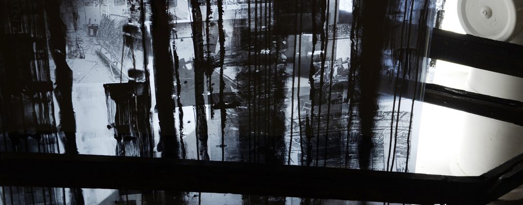 Cabinet of Ambiguity is a site-specific installation which explores a notion of the unseen through amalgam of structures and visualized memories. One part to encounter is a wooden construction resembling a barrier, it’s dynamically positioned in the moment of destruction and it’s unclear if it’s there to shield or rather reveal. The second part consists of semi- transparent mirror film carrying distorted compositions of diverse personal working environments. Through diversity of form, medium and content, a moment of transition arises, a fluctuation between hidden and obvious, past and future, creation and destruction.