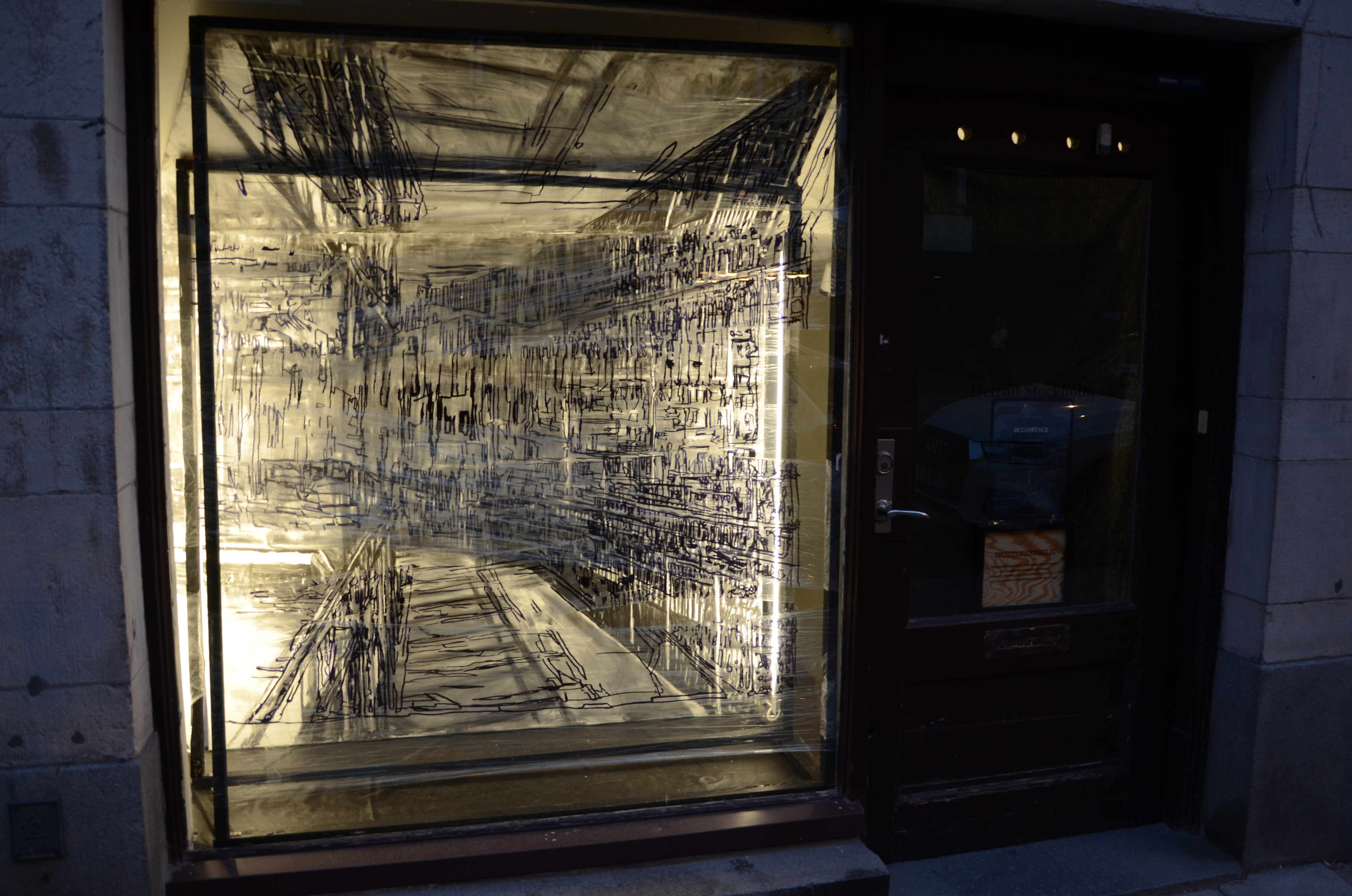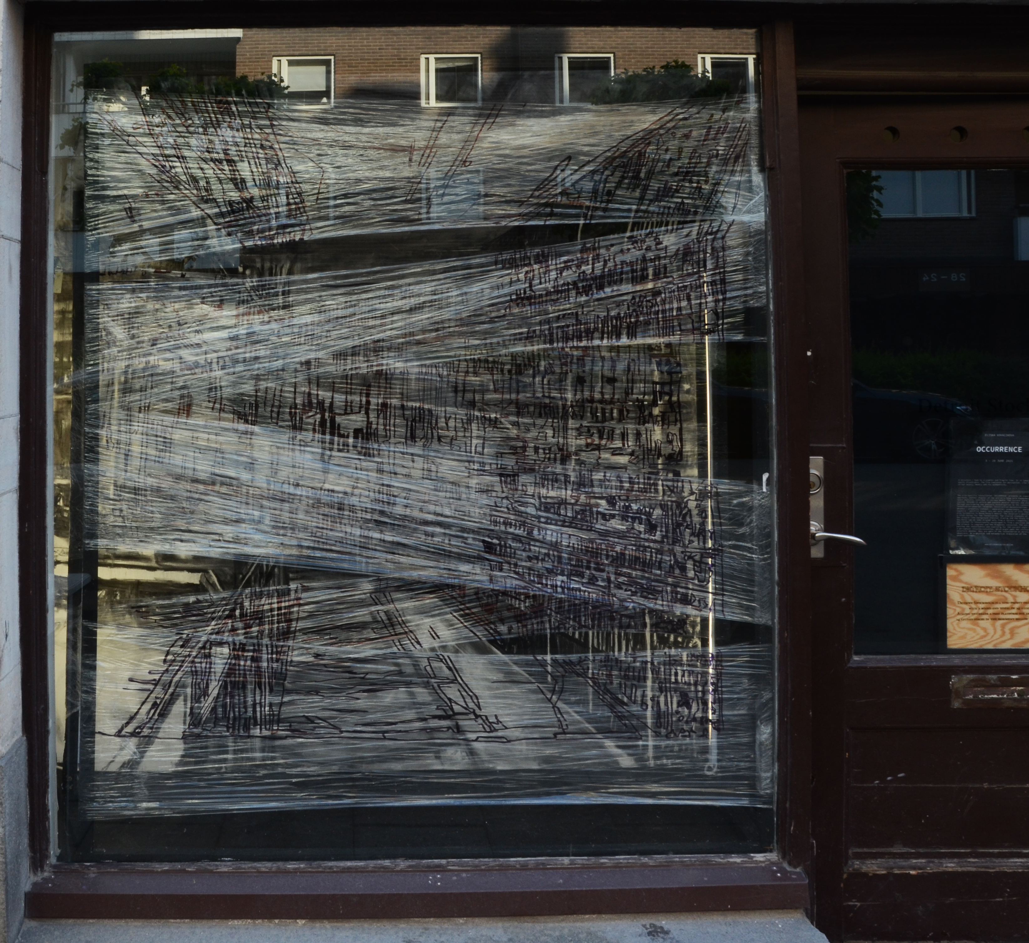 The site-specific installation ‘OCCURRENCE’ presents an experimental approach, another chapter of the artist’s long-term engagement with space analysis, unfolded in various media. The current phase of this journey intends to unfold and explore several notions and dichotomies through positioning the artistic investigation in the context of installation-observer relation. Construction-deconstruction; absence – presence; contact – separation; unawareness – awareness; negative – positive space, are not only subjects of this inquiry, but also leitmotivs in Kovacikova’s oeuvre. The observer’s position is a vital factor for the installation. Two crucial elements of the installation (the background charcoal drawing and the black lines on the foil) can be seen aligned only from a certain viewpoint, so the visitor is intentionally encouraged to find a position where the artwork is complete and the fragments connected. The act of passing the installation and searching for the correct angle creates a perceptual illusion/sensation, which might make the visitor uncertain whether they are part of the installation or merely observers. As a physical and metaphorical transition of the power-positions.