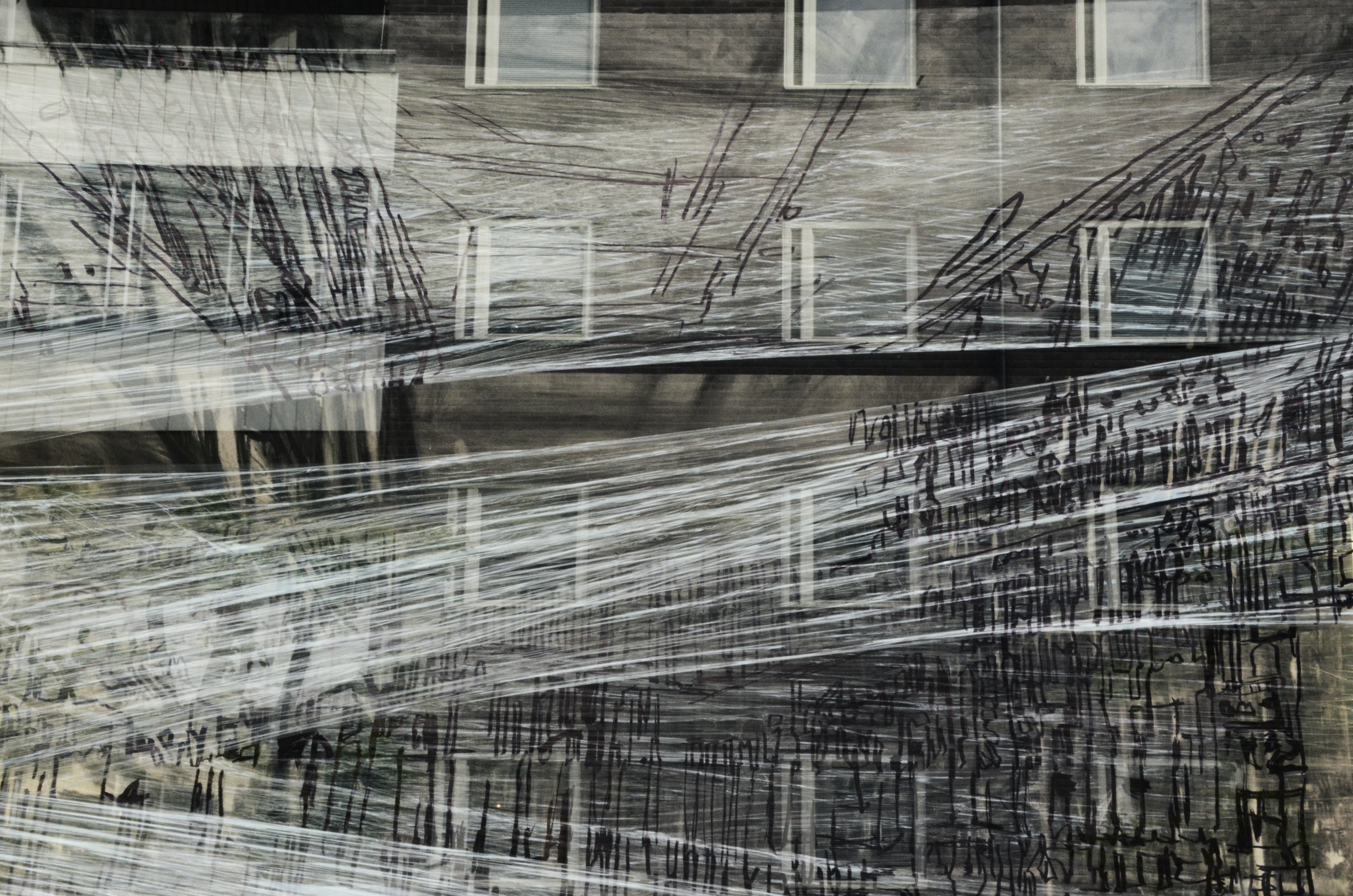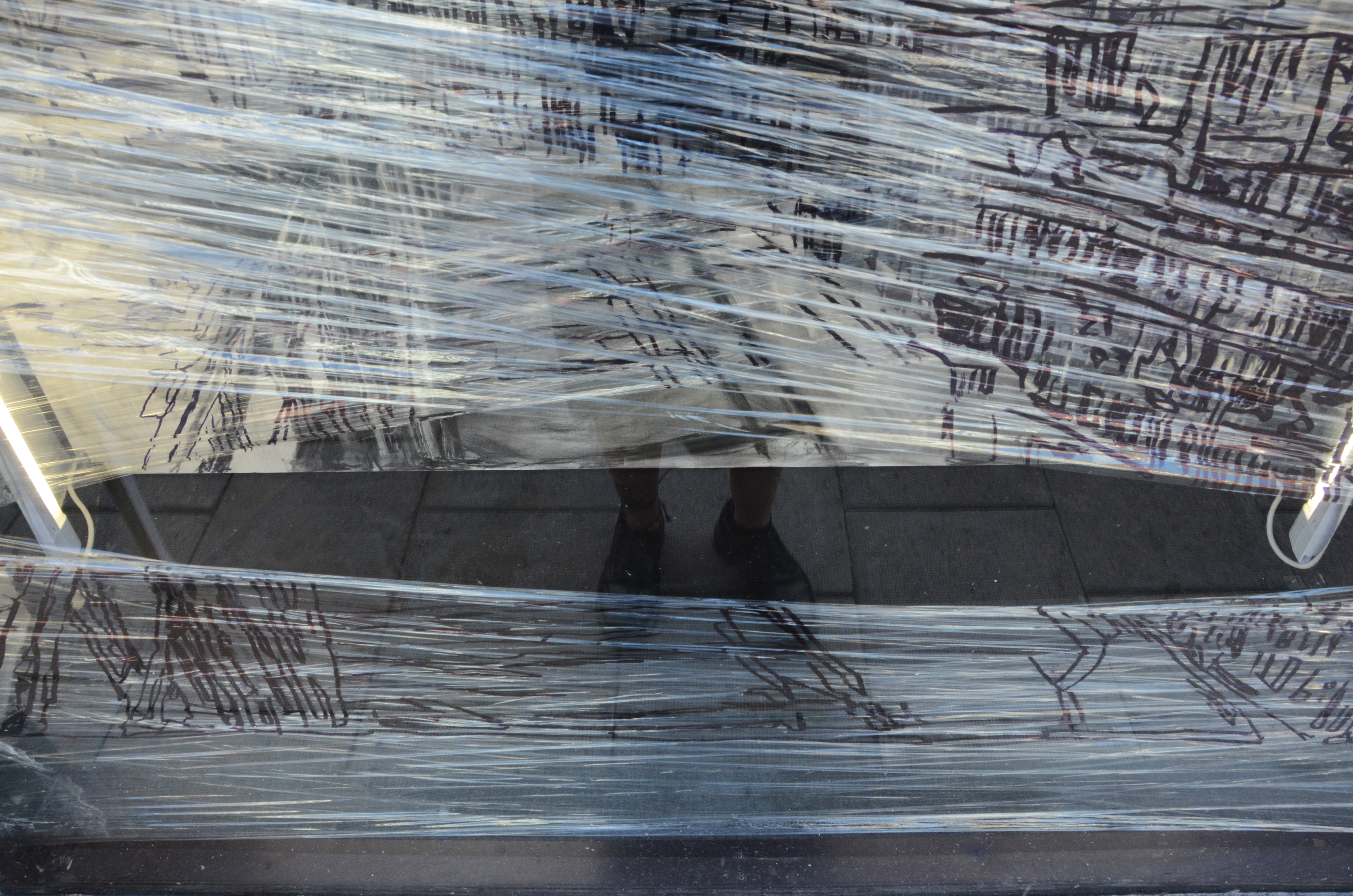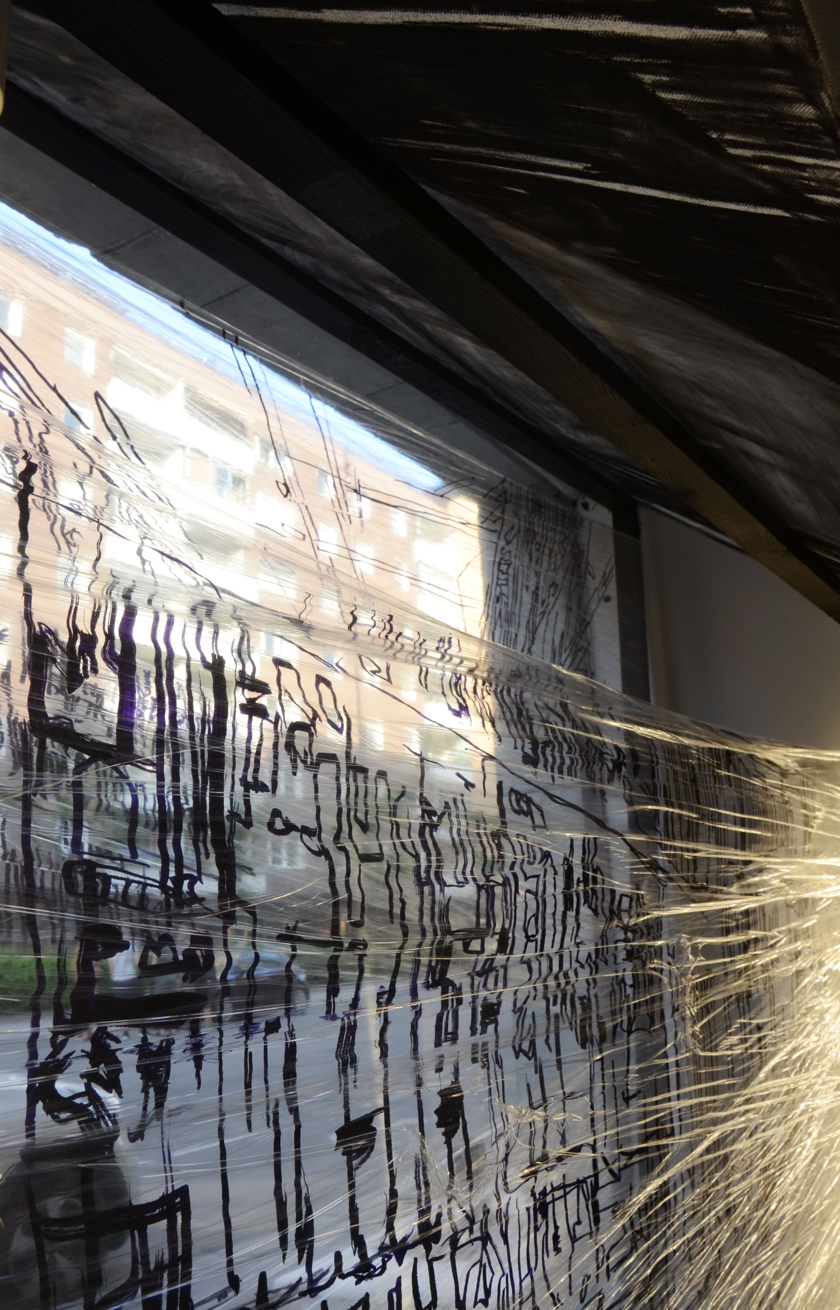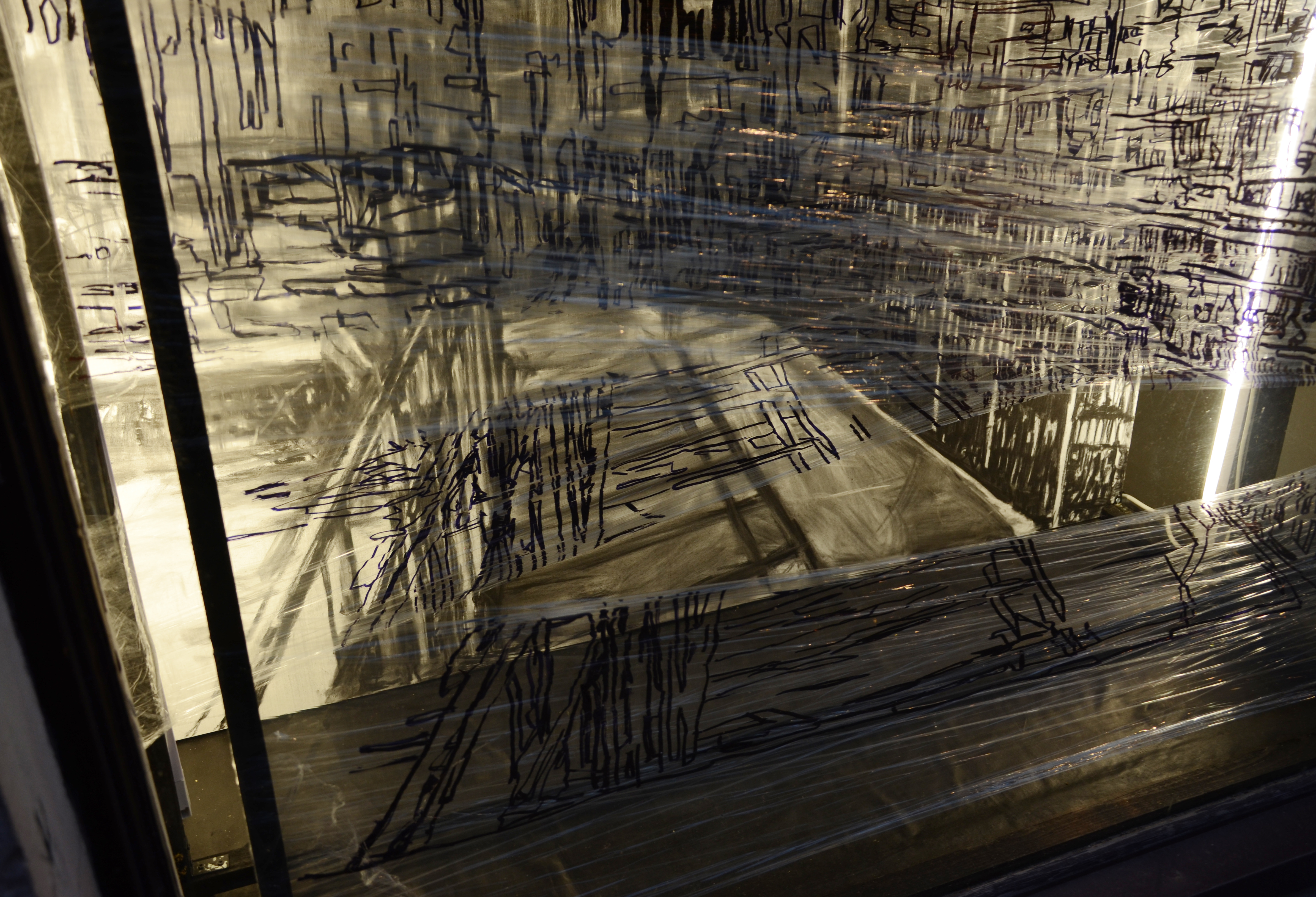 Material: Charcoal drawing on canvas/ black marker on plastic film