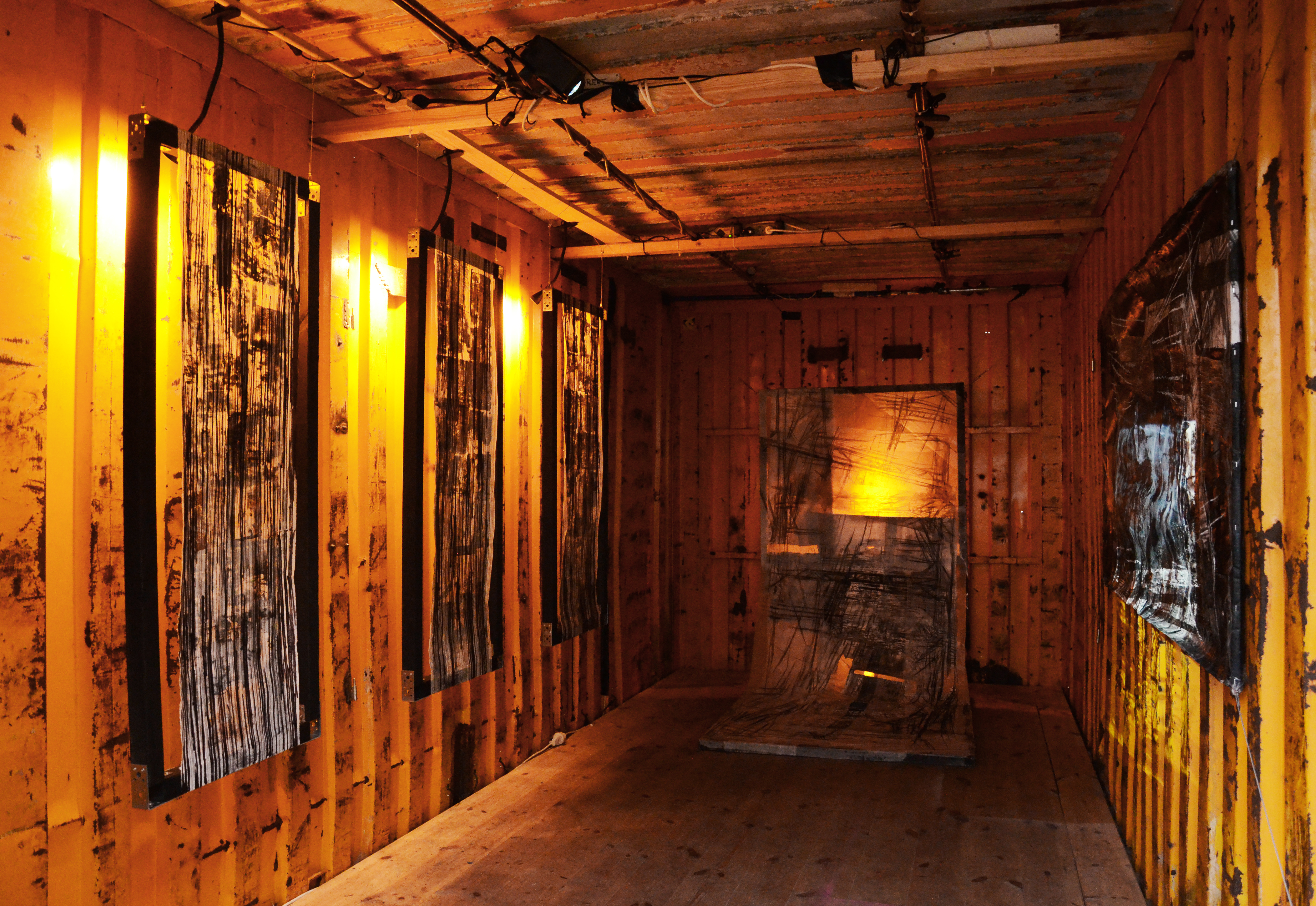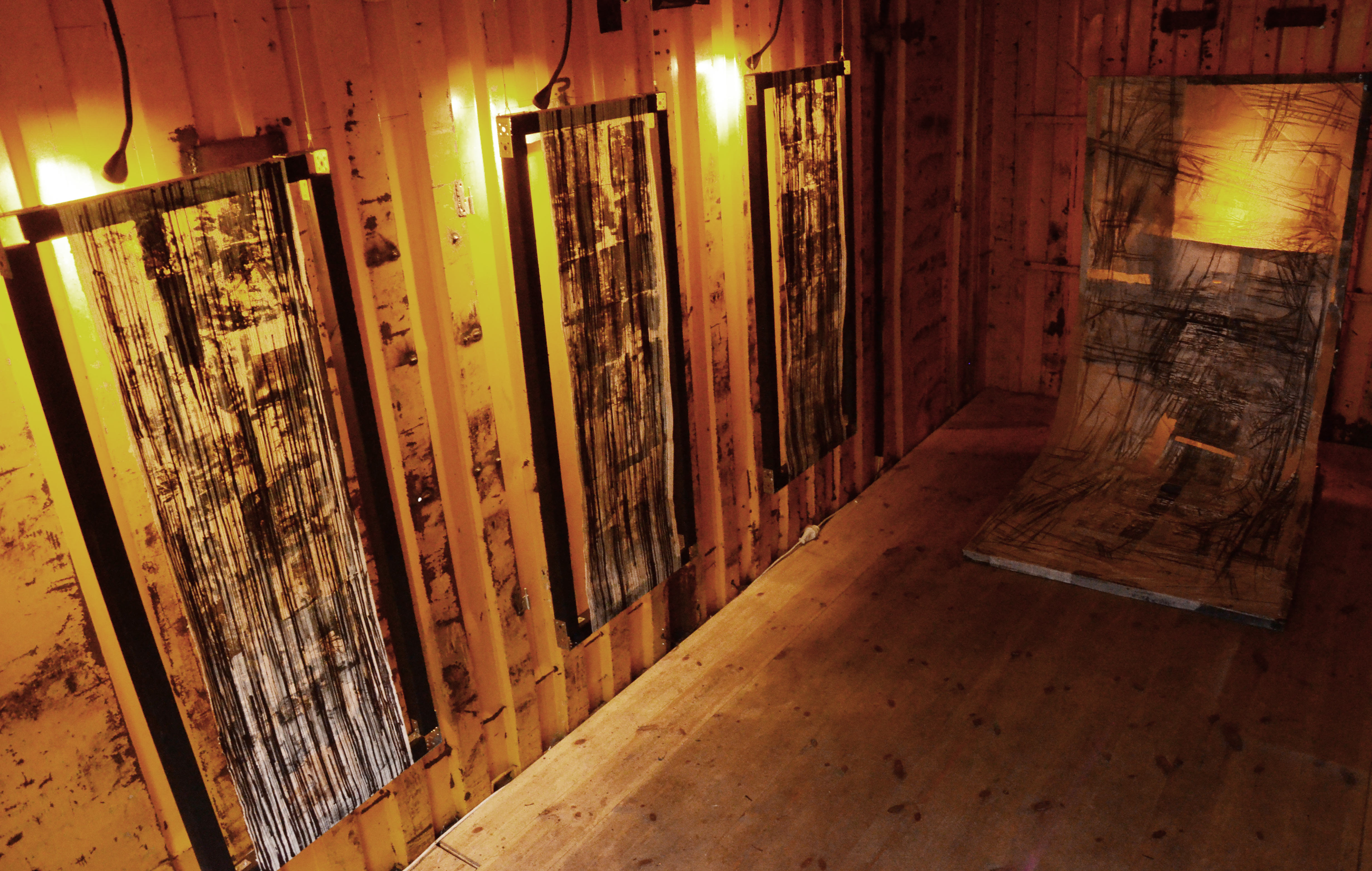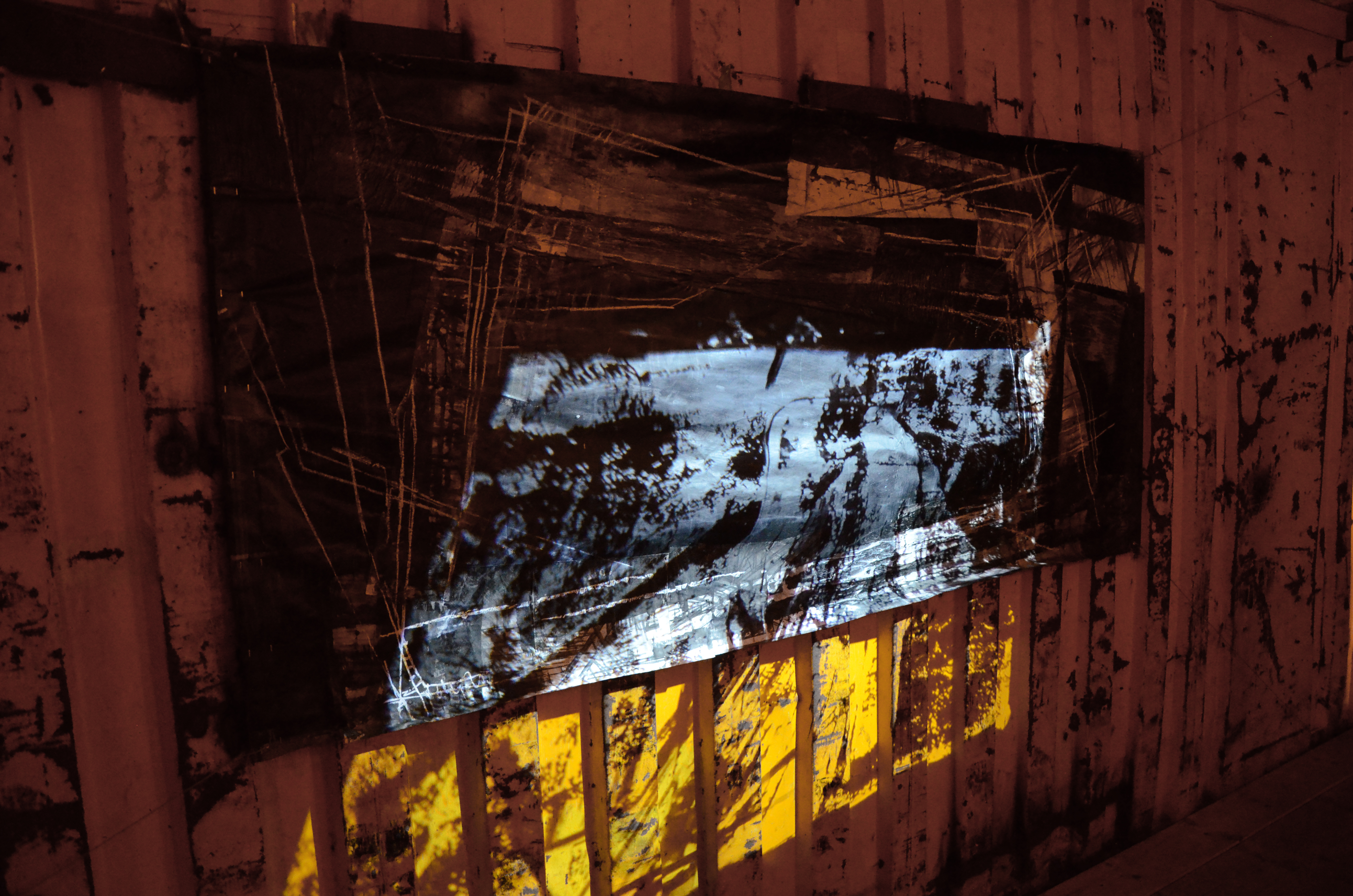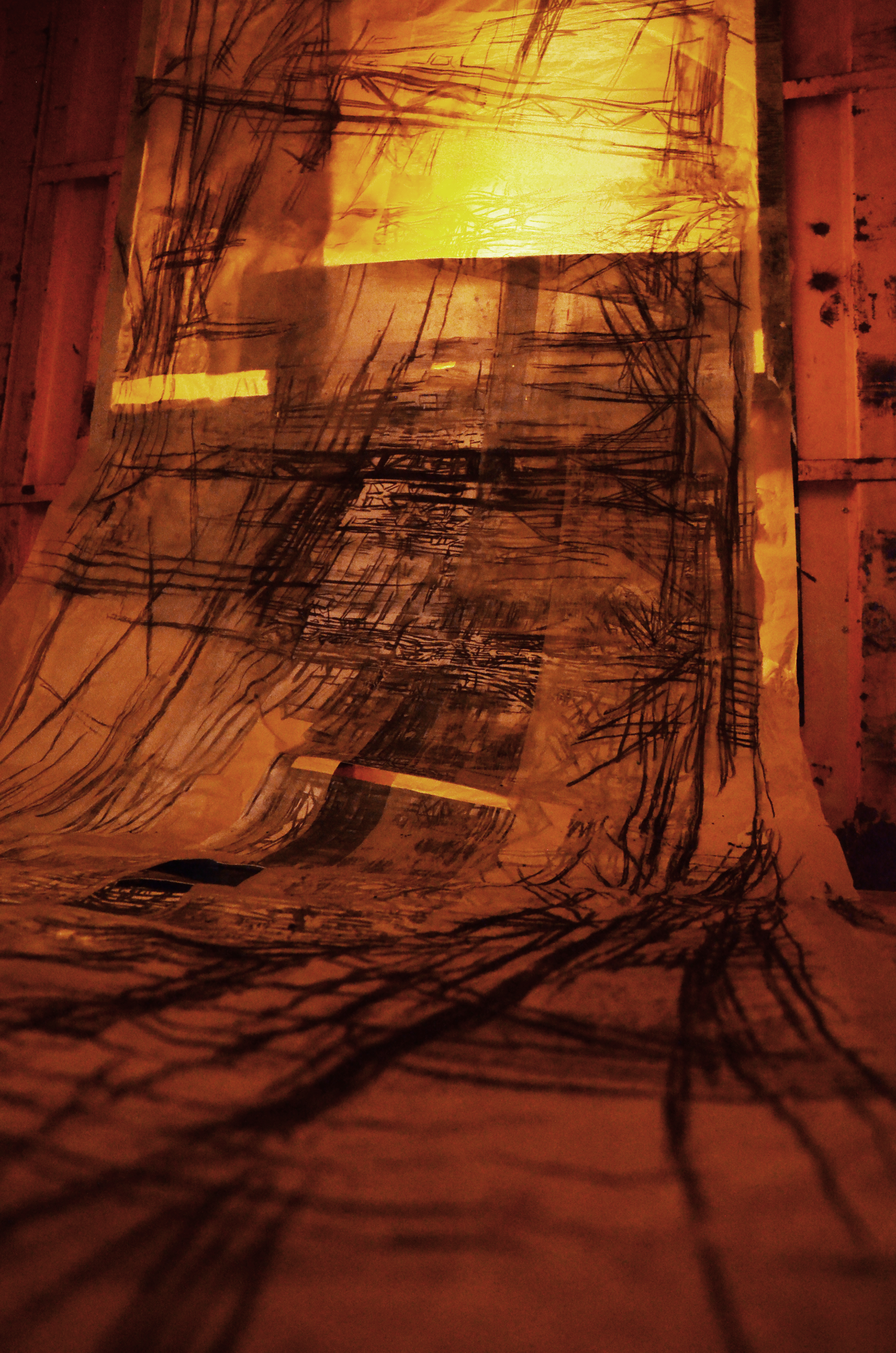 Retrospection’s Part 2, also entitled The Work of Transition, is a third version of the same piece installed differently than before. First appearance: dispersed all around; then stretched tight on frame and finally now hung up and placed on the floor. This piece has a three year-long transition period, during which it lost its form but gained new shape. It’s present now but many parts are absent. Its own appearance reflects its disappearance.