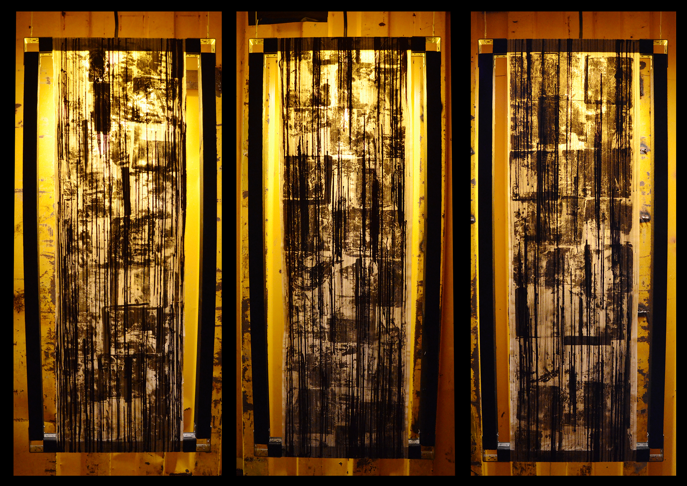Retrospection’s Part 1 consists of three non-identical artworks. A multiple-layer composition stretched on wooden frame flows vertically or reversed. It has layers, and alike time, it moves through several fragments. The bottom layer inspired by the notion of collapse, which revokes destruction but also a new beginning. It repeats, it never ends.