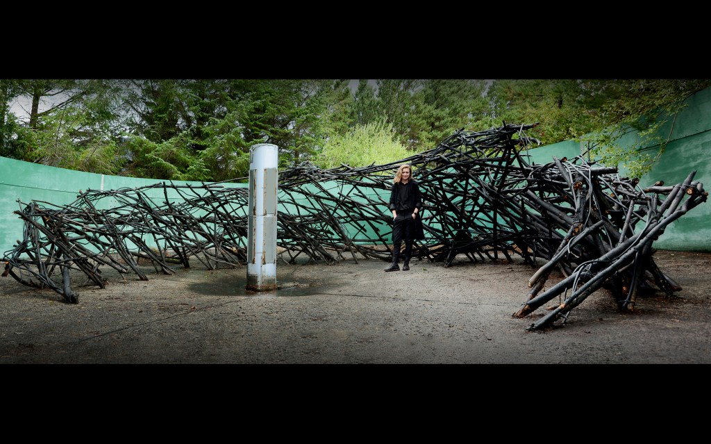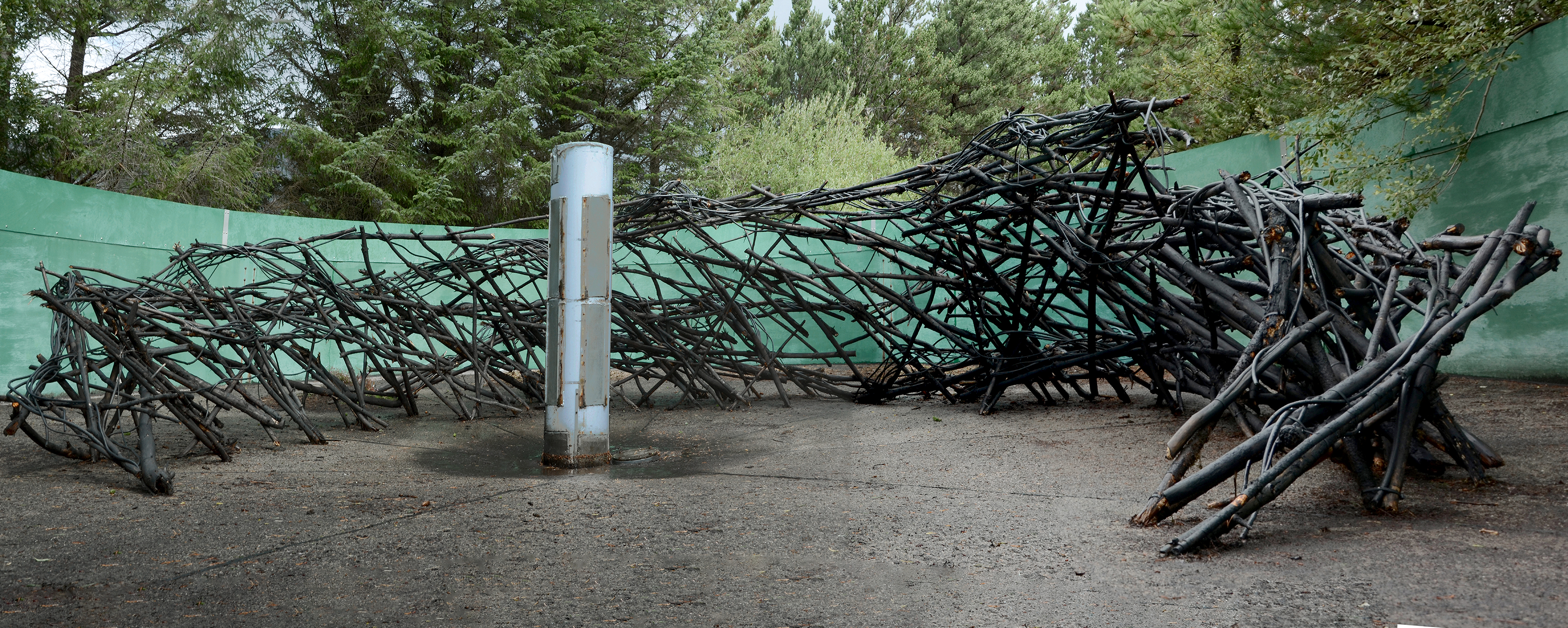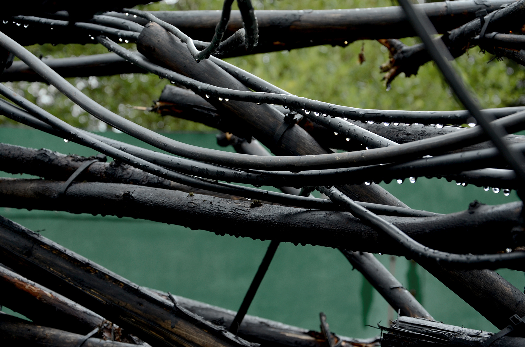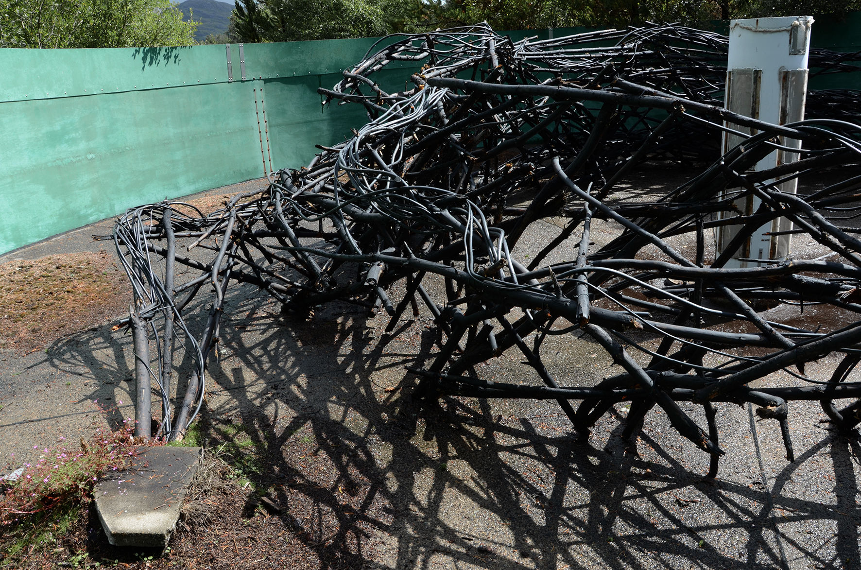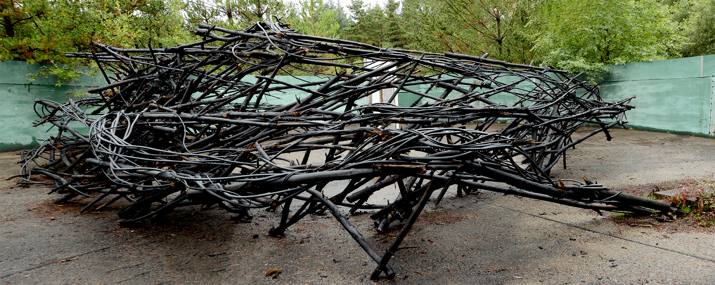 ‘Symphony of Drowning’ explores the remains of the local environment of a former salmon hatchery, with emphasis on its hidden elements and space between them. The installation consists of found black electric cable and over 600 wooden pieces collected from the surrounding forests, each different size and shape, partially deformed or broken. Together they create a dynamic body, a construction that flows around, rises and descends into the ground, flies and then collapses in the air.