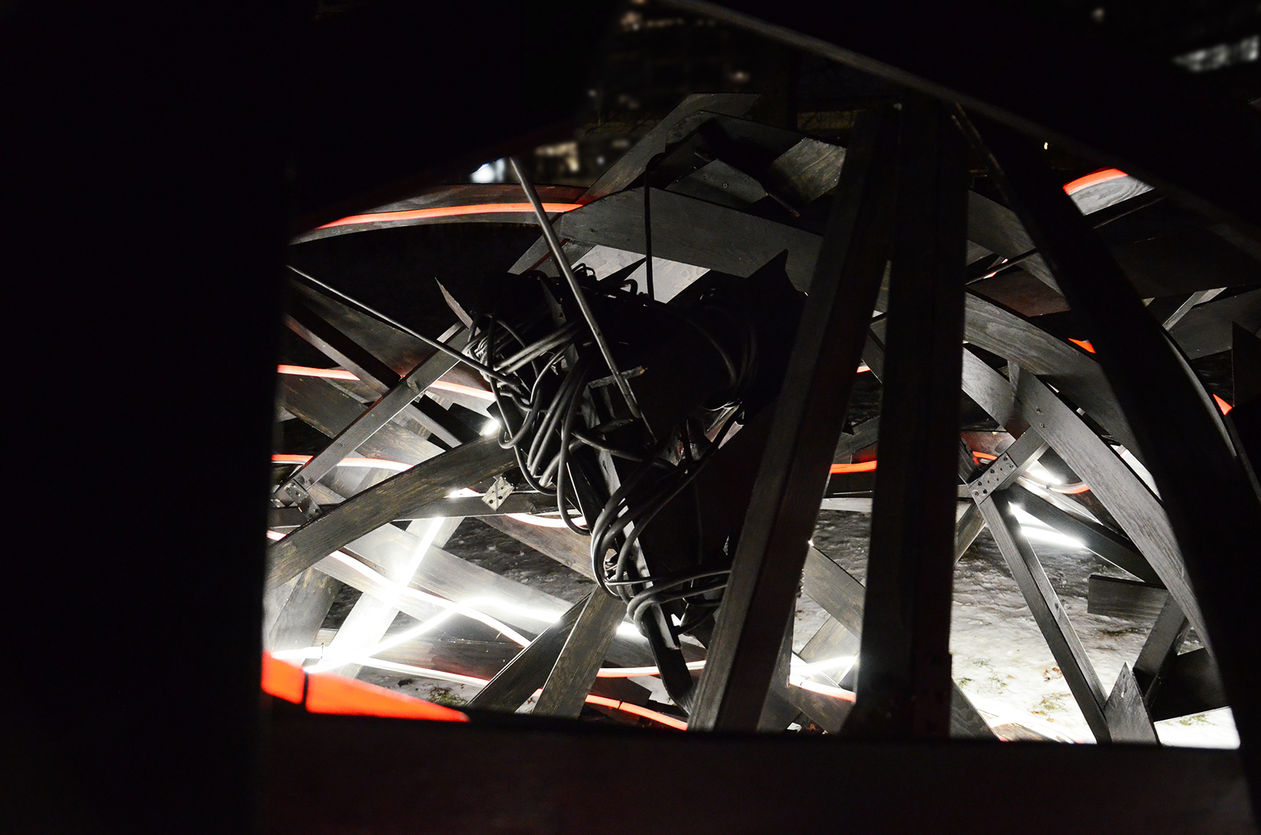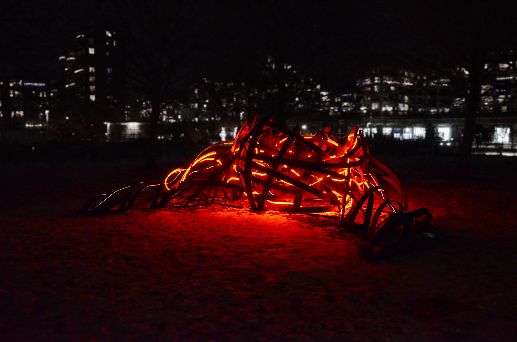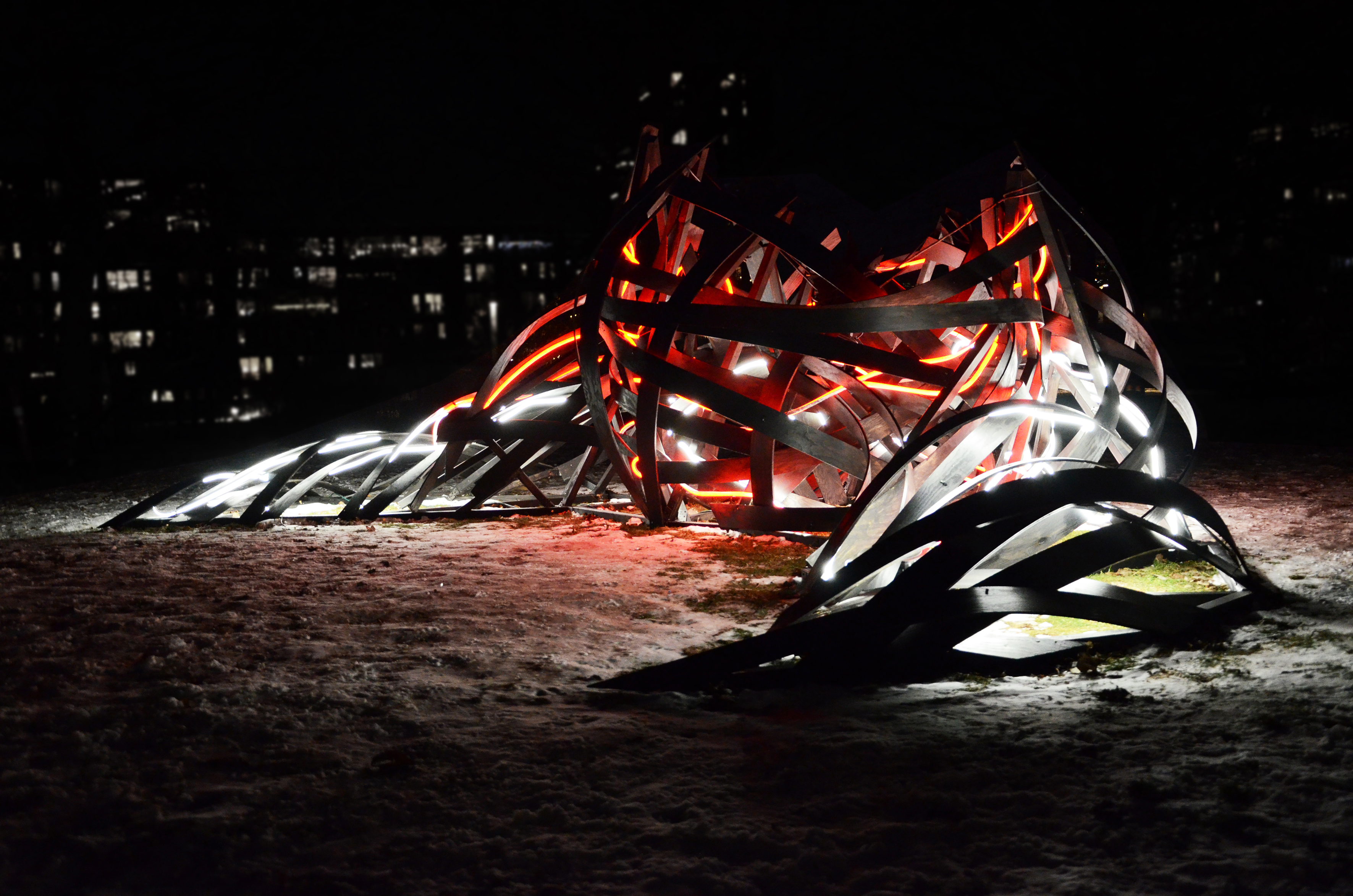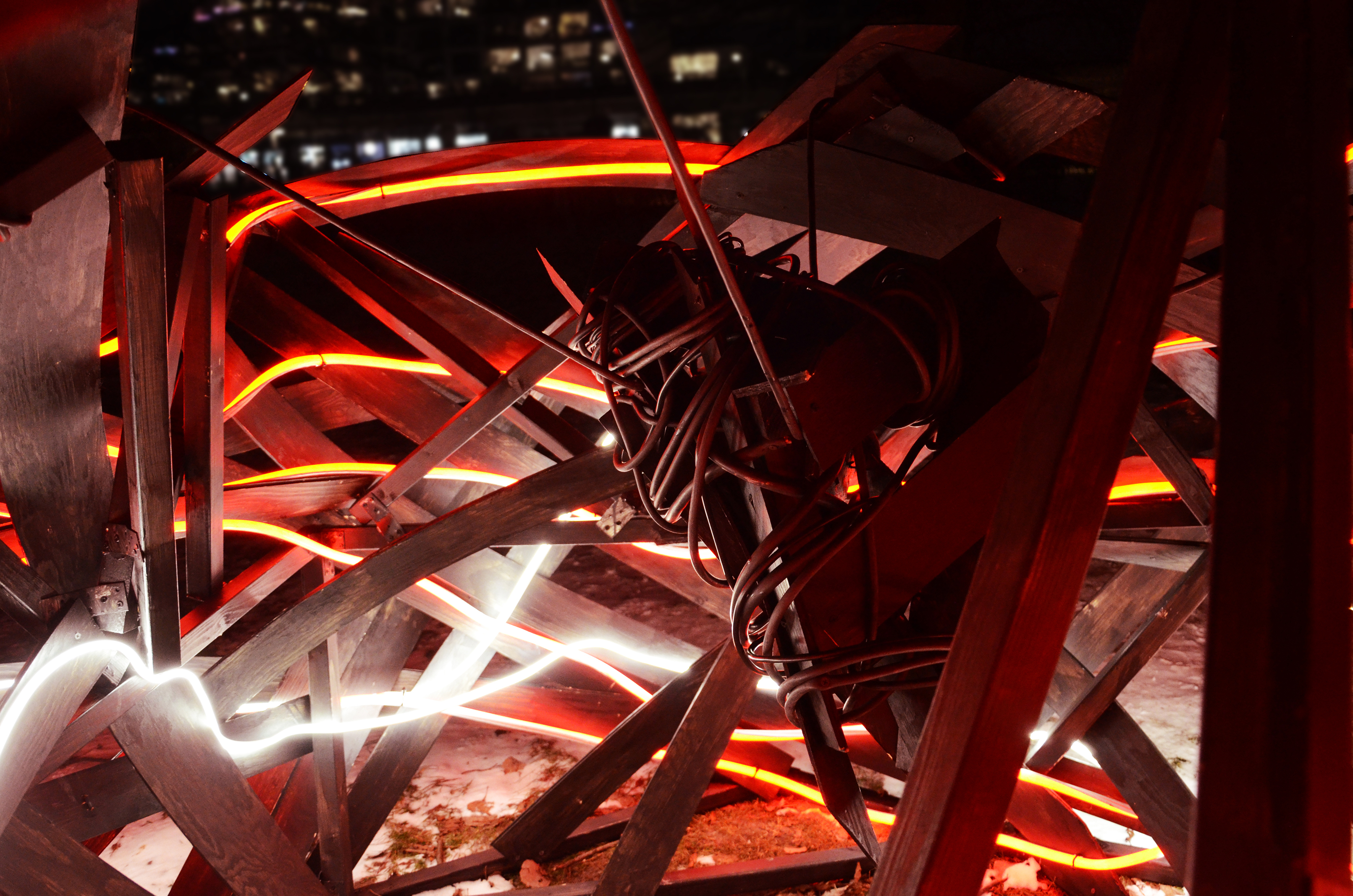 Using materials such as thin plywood planks and Neon Flex LED, the installation consists of deformed surface fragments of the human body bound together to form a structure that engages with the surrounding environment through its own energy. It moves dynamically in the air, appearing and disappearing, simultaneously dominating and infiltrating the space. Resembling an abstract body in the midst of transformation, the work highlights a continual shift between something and nothing, presence and dissolution. In this sense, the installation can be understood as an experimental interplay — a fragment of a closed space, a shelter, or a remnant of what has occurred or what may yet emerge.
