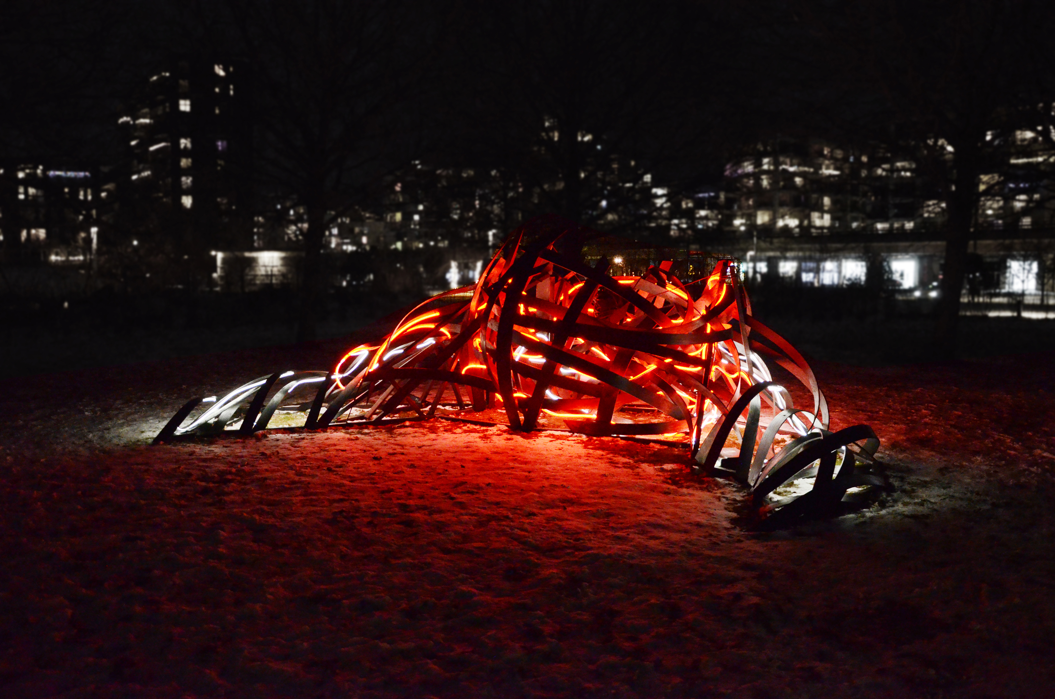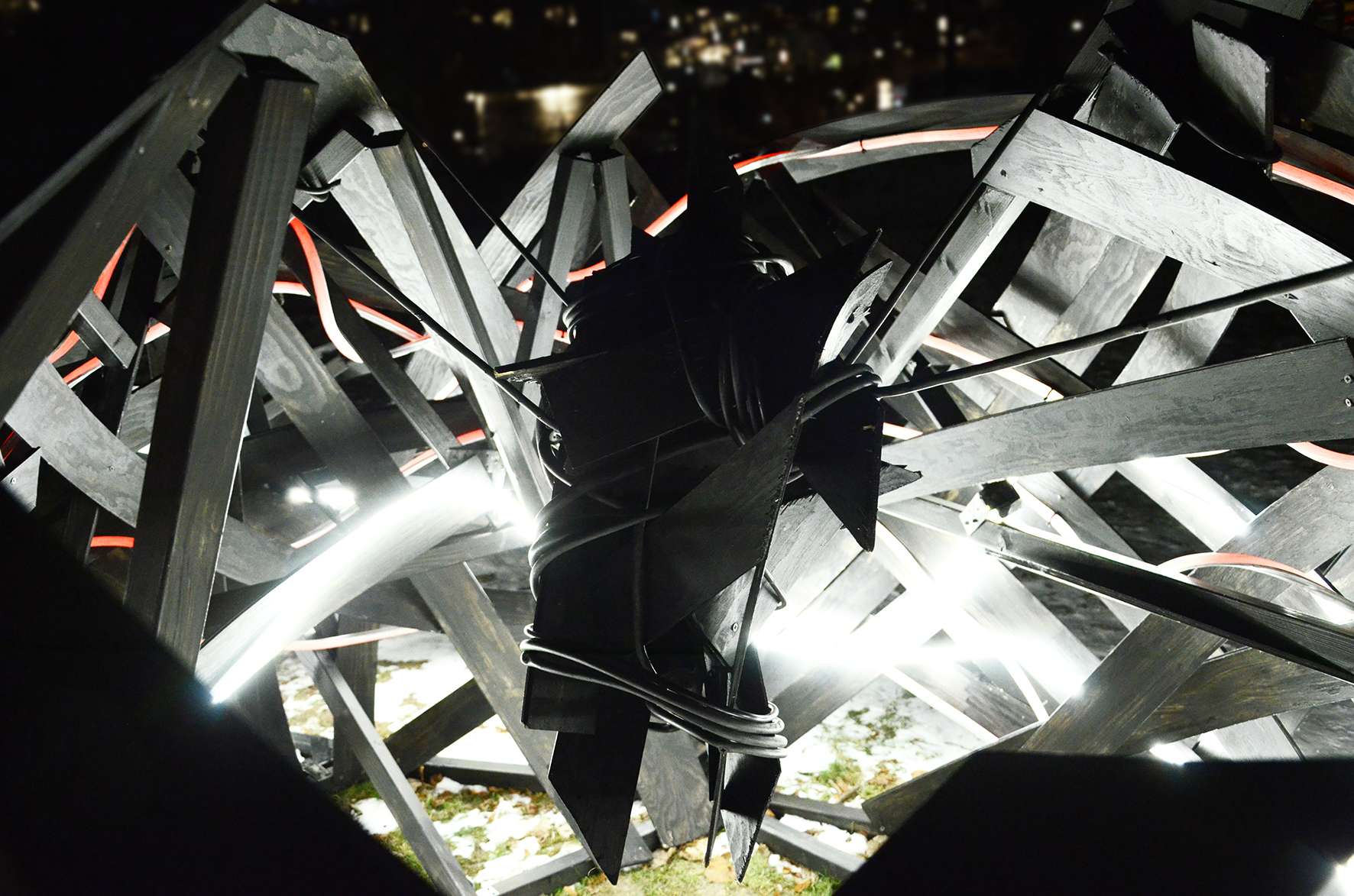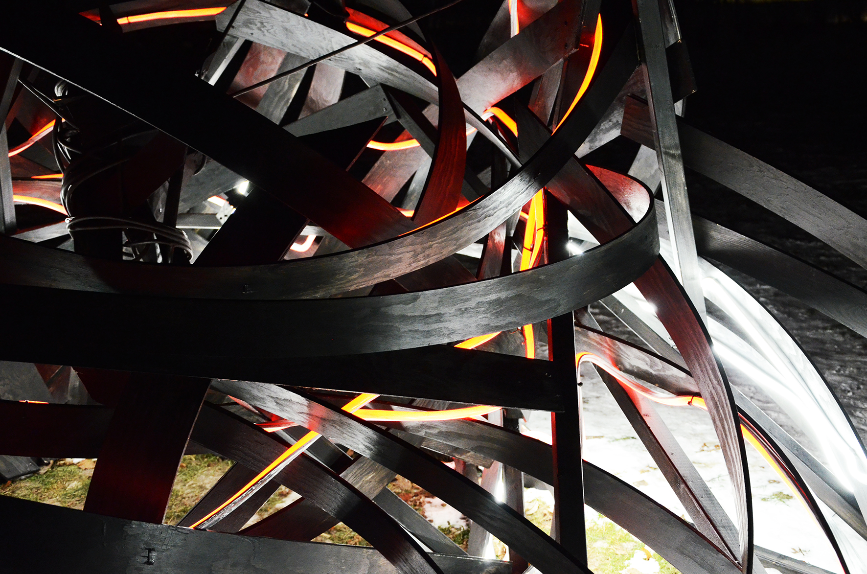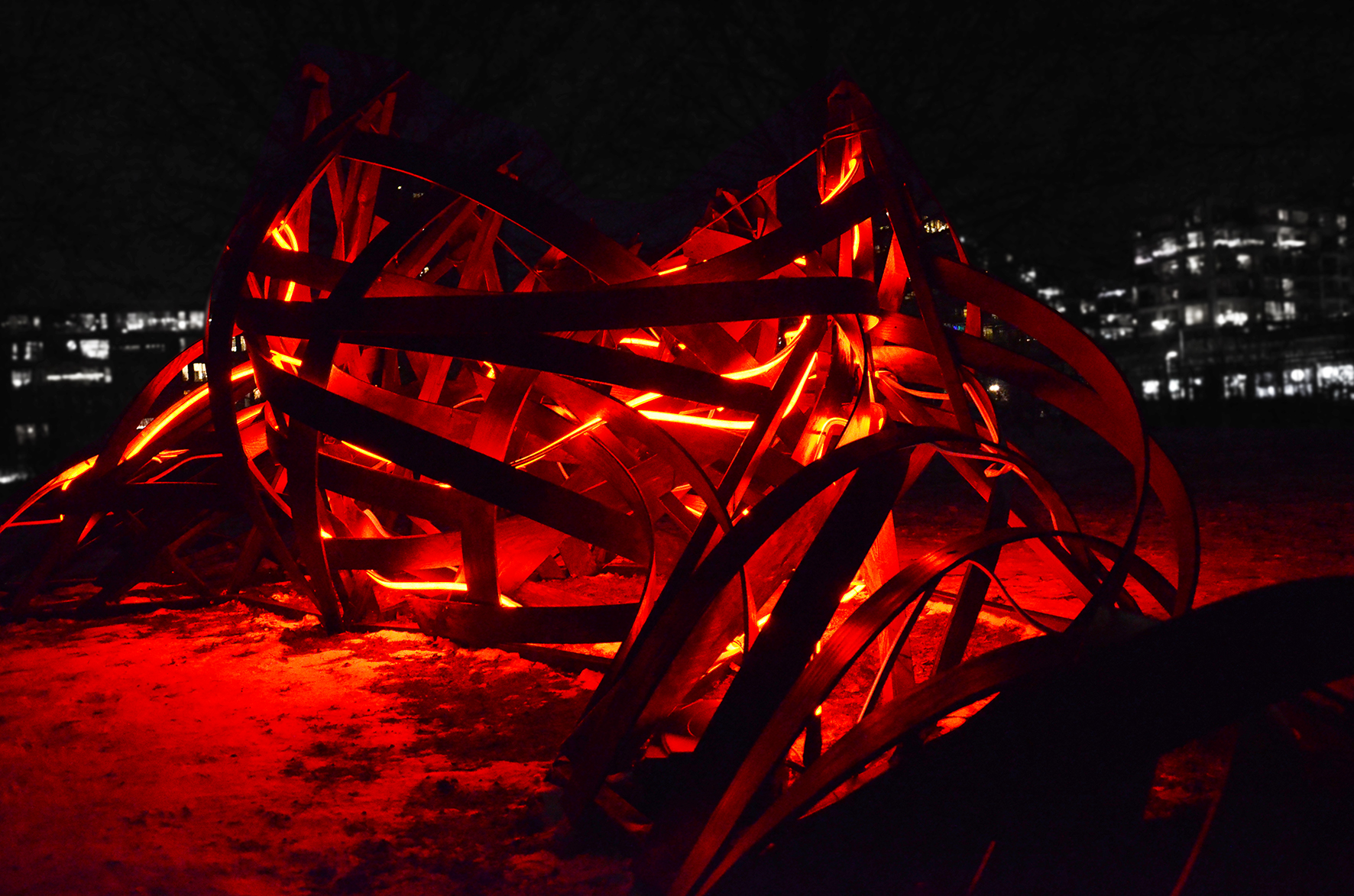 Using materials such as thin plywood planks and Neon Flex LED, the installation consists of deformed surface fragments of the human body bound together to form a structure that engages with the surrounding environment through its own energy. It moves dynamically in the air, appearing and disappearing, simultaneously dominating and infiltrating the space. Resembling an abstract body in the midst of transformation, the work highlights a continual shift between something and nothing, presence and dissolution. In this sense, the installation can be understood as an experimental interplay — a fragment of a closed space, a shelter, or a remnant of what has occurred or what may yet emerge.