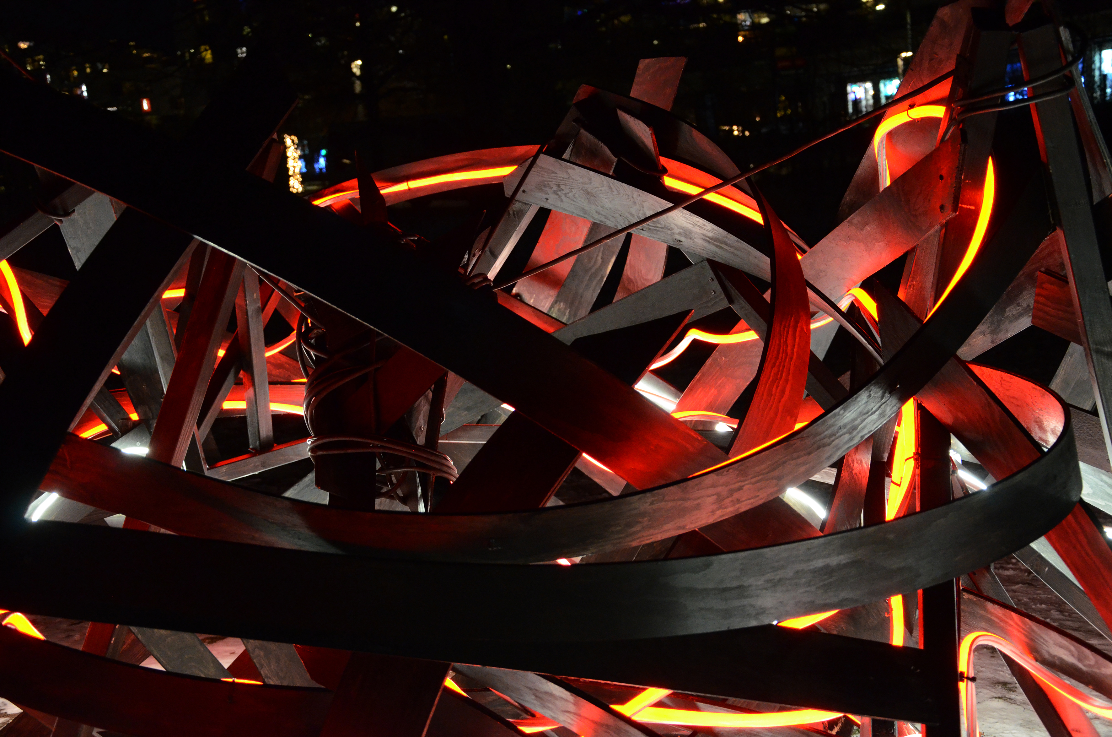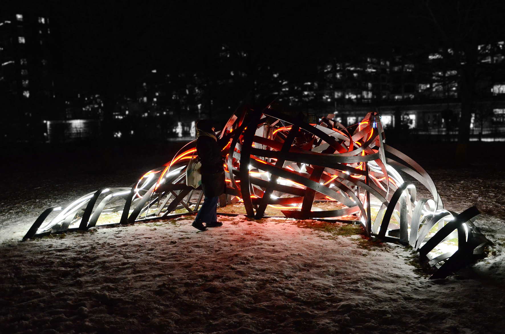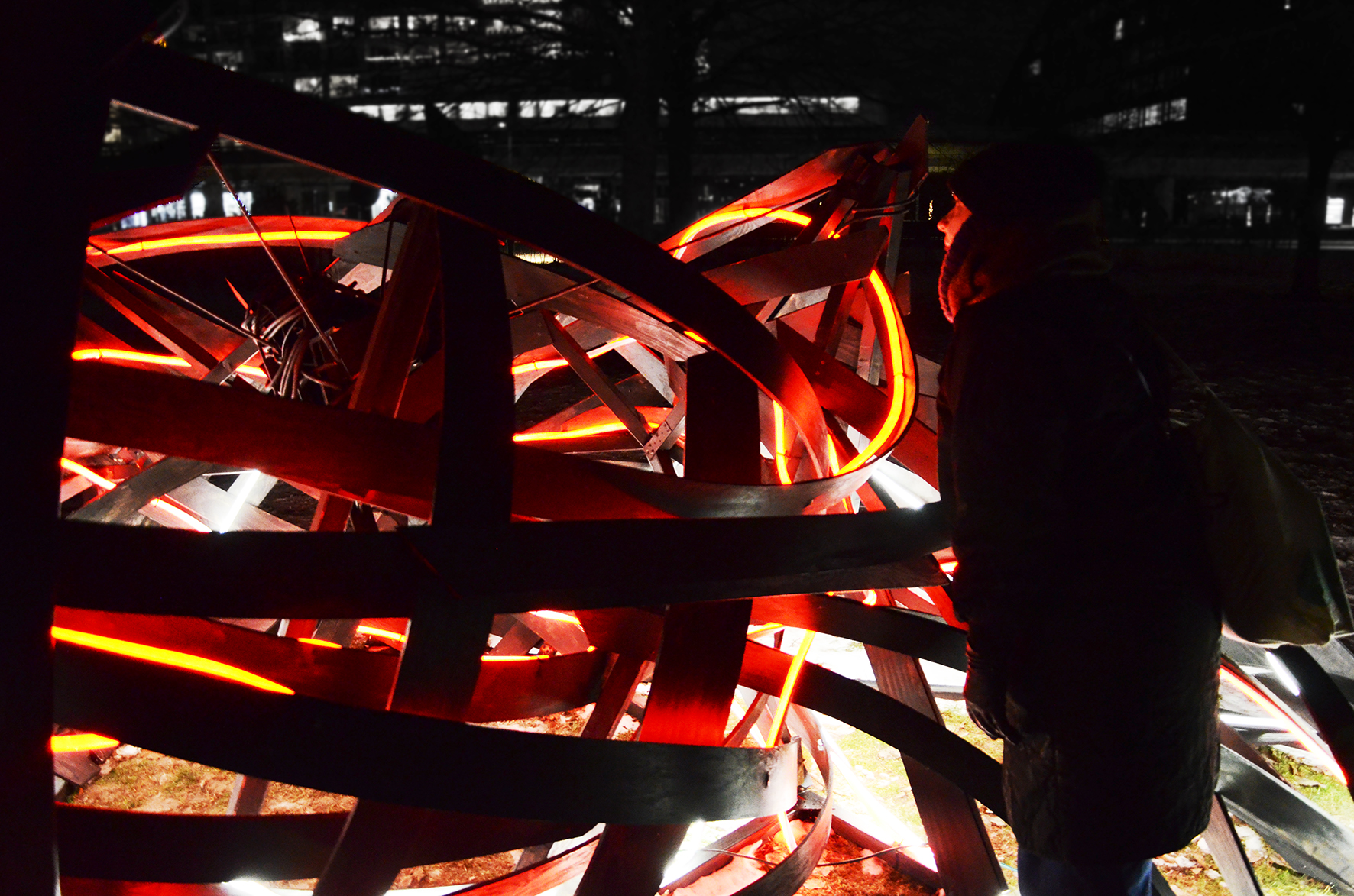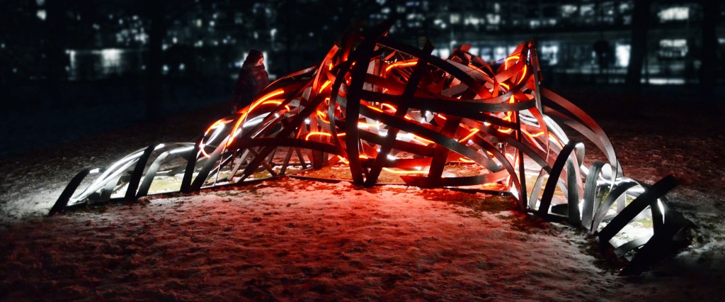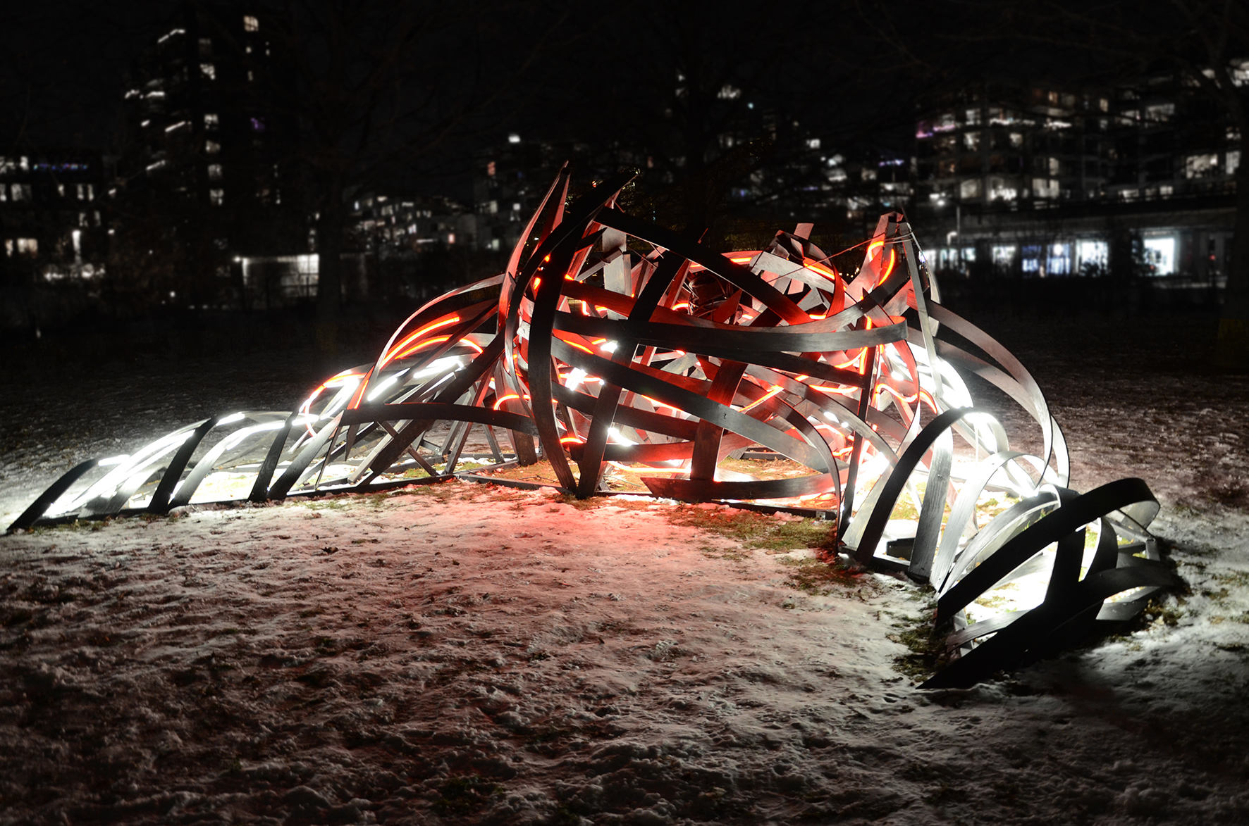 Using materials such as thin plywood planks and Neon Flex LED, the installation consists of deformed surface fragments of the human body bound together to form a structure that engages with the surrounding environment through its own energy. It moves dynamically in the air, appearing and disappearing, simultaneously dominating and infiltrating the space. Resembling an abstract body in the midst of transformation, the work highlights a continual shift between something and nothing, presence and dissolution. In this sense, the installation can be understood as an experimental interplay — a fragment of a closed space, a shelter, or a remnant of what has occurred or what may yet emerge.