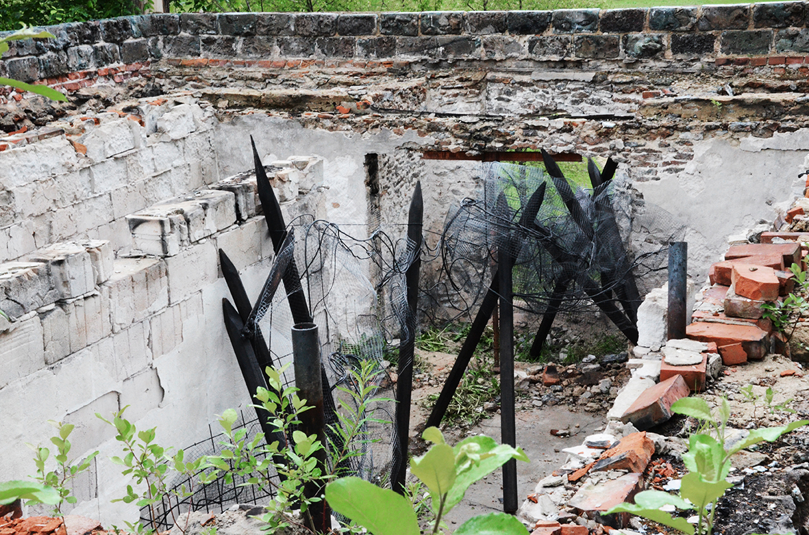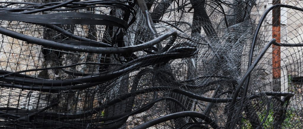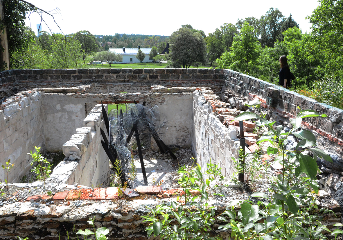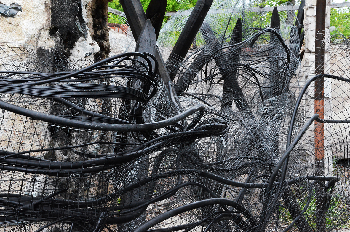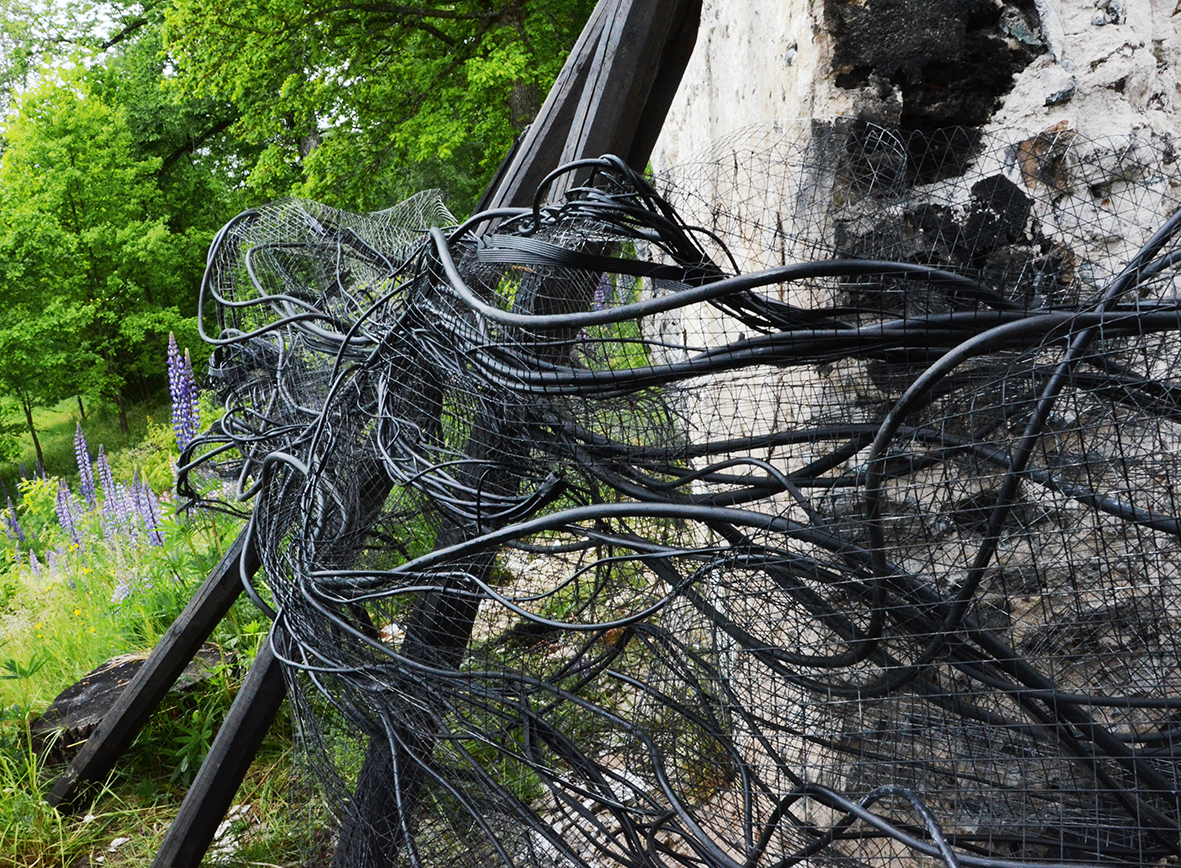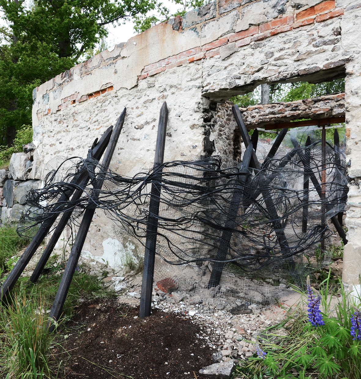 A specific environment can be experienced as both empty and overpopulated at the same time. It radiates a certain energy – a ghostly pulsation that lingers and waits to be witnessed by its viewer. This work is inspired by this energy and creates, through the repetition of different materials, an abstract composition – an echo of this extraordinary territory. The installation consists of wooden poles, reinforcement grid and recycled electrical cables, and its form directly reflects the place where it is installed – an old ruin, the remains of a burned-down building.