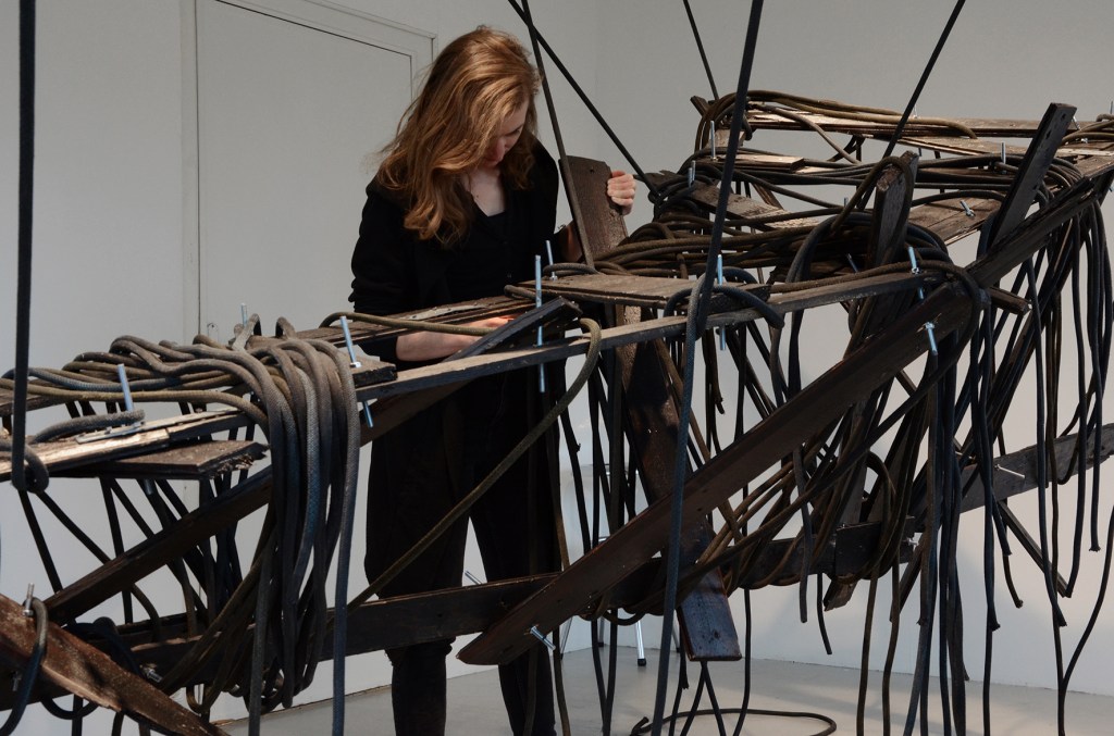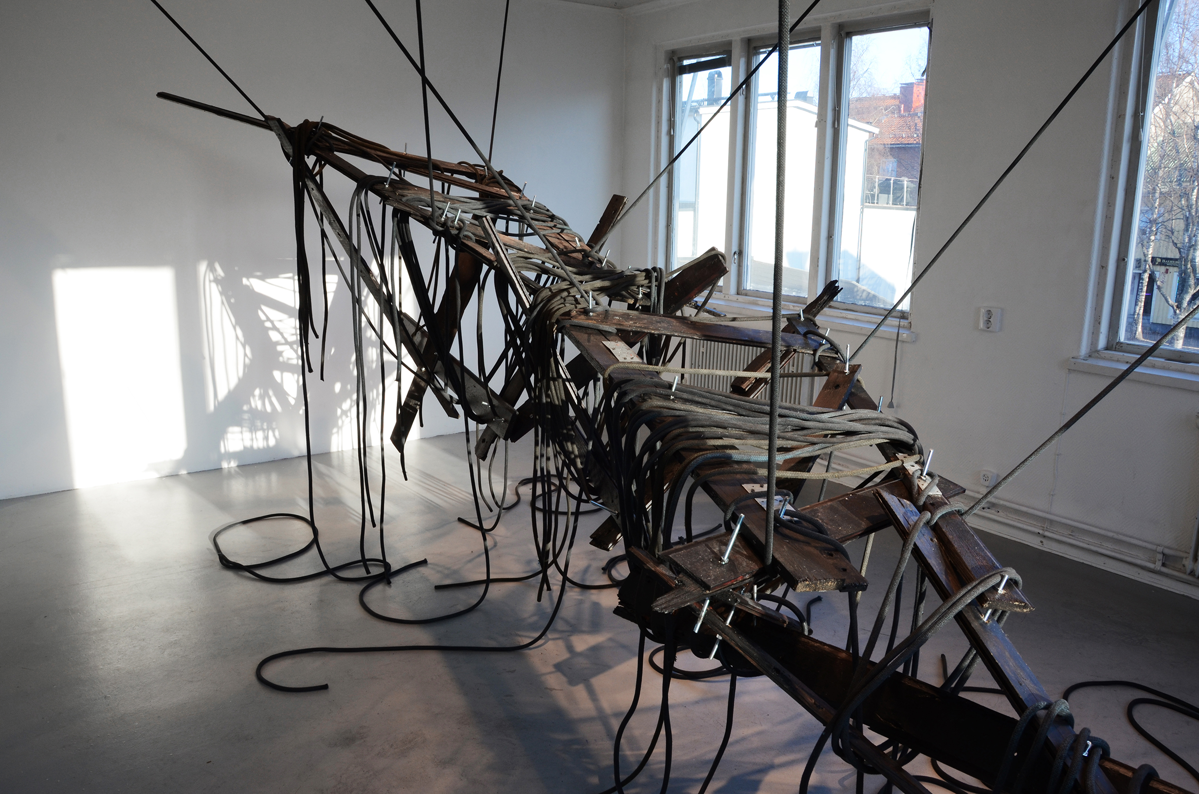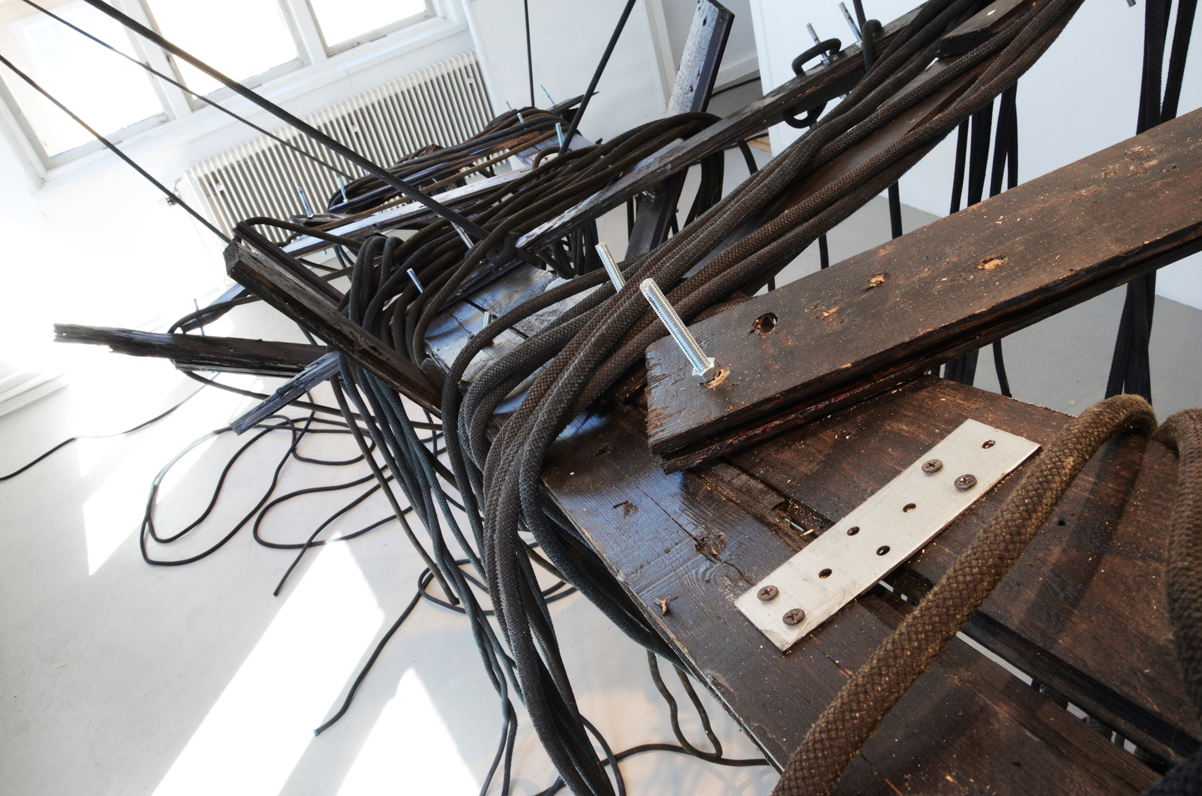 ‘withstand’ is an experimental project, where the artist uses the body as a metaphor and in doing so, explores the notion of control and power. In this case the form of the installation doesn’t embody a concrete notion, instead, the material becomes prominent where the artwork’s attributes and features take the lead and fill up the space. Cracked and broken wooden structure, loosen steel bolt joints and flexible ropes, all selected with a sole purpose to build a shape shifting body, which under its own weight slowly descends. The act of creation is succeeded by unsteadiness and heaviness of the material, where the artwork slightly alters its form over a longer period of time. Seemingly trapped and powerless, but taking its own course of surrender, this structure is perceived as the survivor, an independent spirit of resilience.